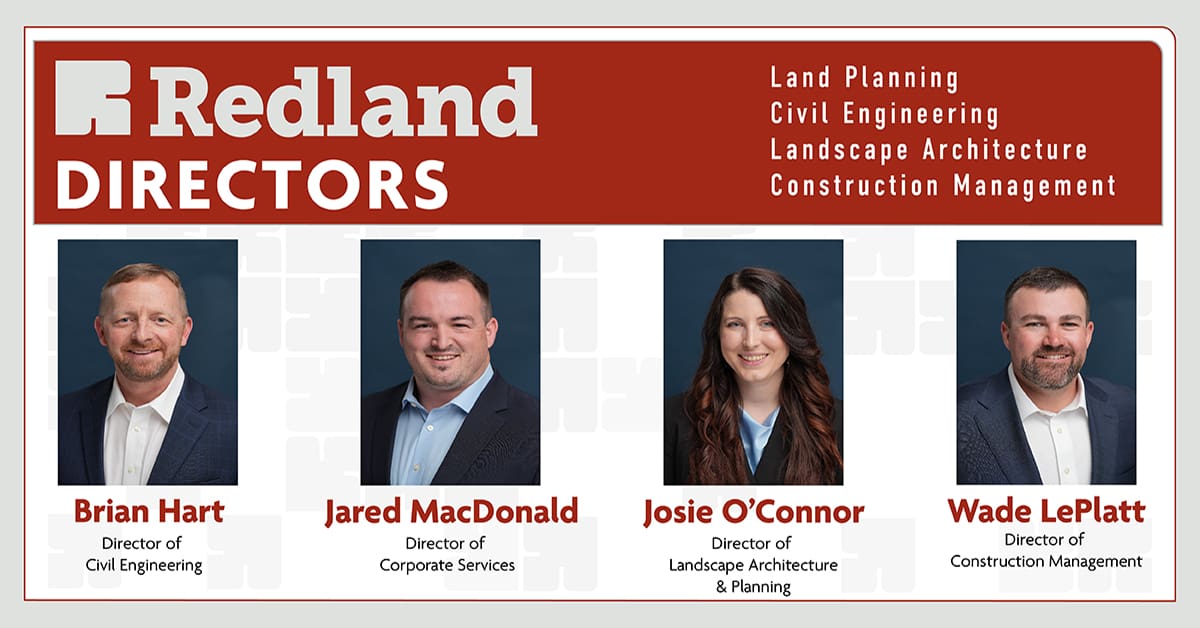 Since its formation in 2008, Redland has evolved into a full-service land development consulting company offering expertise in Land Planning, Civil Engineering, Landscape Architecture, and Construction Management. As the company prepares for its next generation of growth, Redland has promoted four seasoned leaders and principal owners to director positions, expanding its leadership structure designed to elevate and deliver even greater value to clients through streamlined and coordinated service.