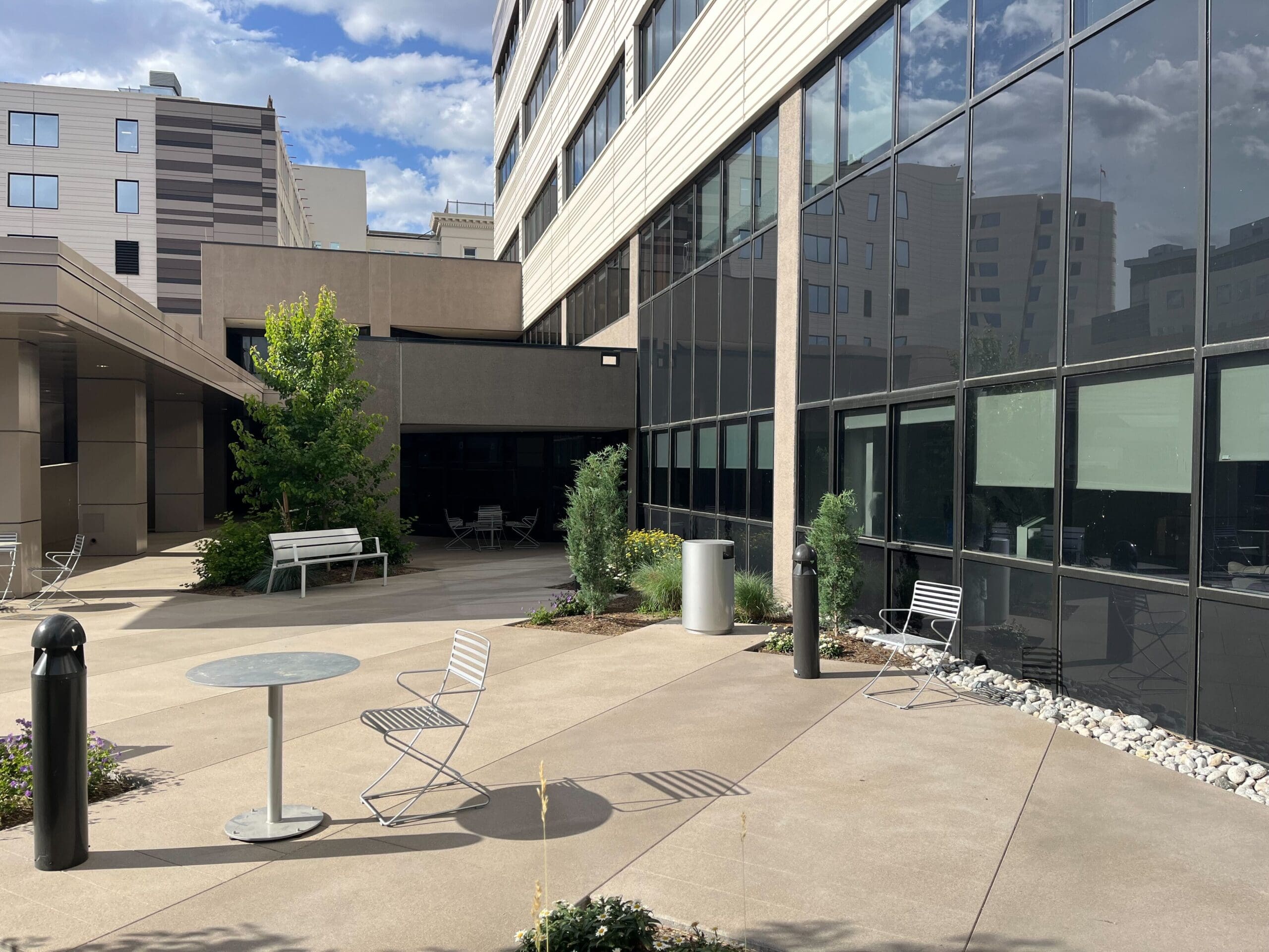 The enhancements were made between St. Luke’s tower buildings, necessitating work over existing structures while minimizing the active construction zone. Redland provided civil site design for the corridor and plaza, focusing on ADA compliance, traffic circulation, and the replacement of a snowmelt system. The Landscape Architecture team revitalized a sunken plaza with new plantings, site furnishings, irrigation, and concrete planters. Before-and-after photos of the plaza can be seen below.