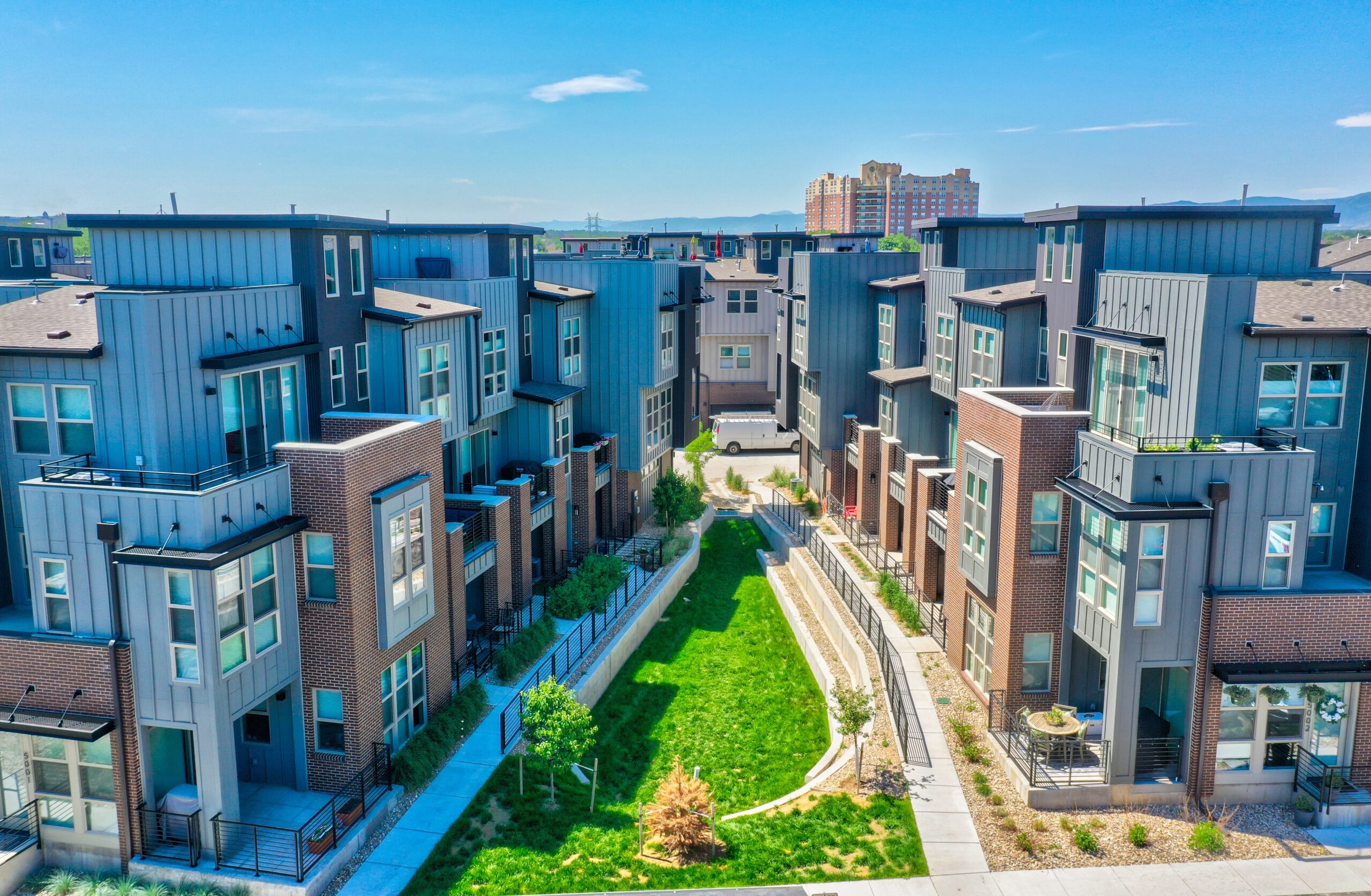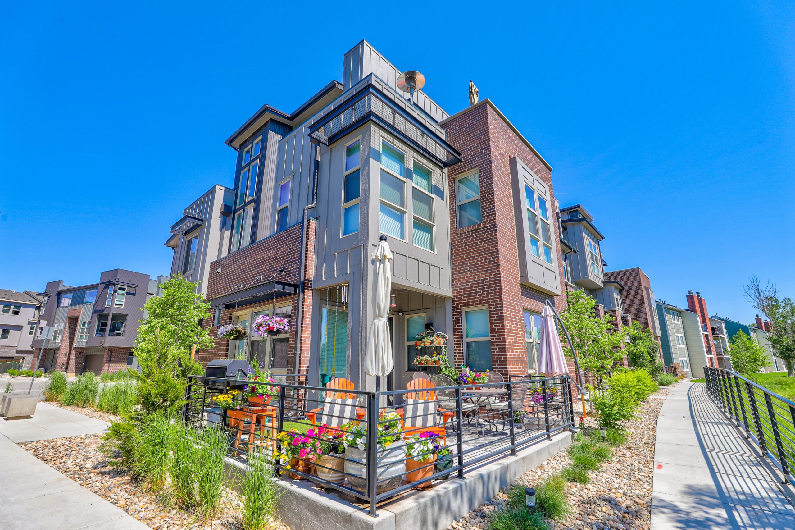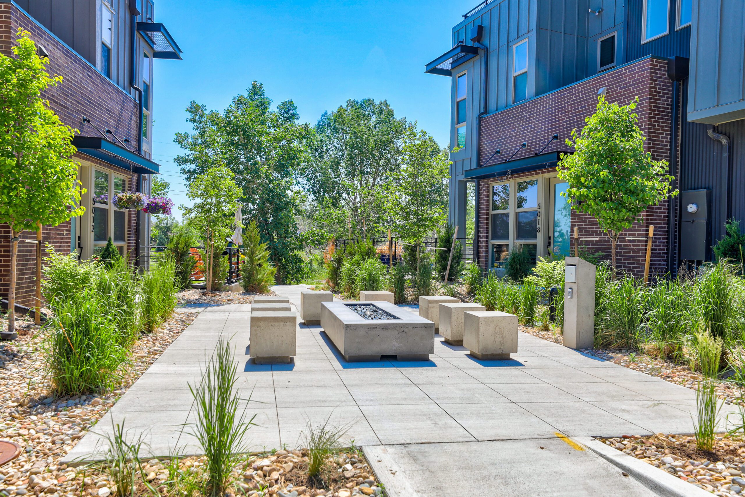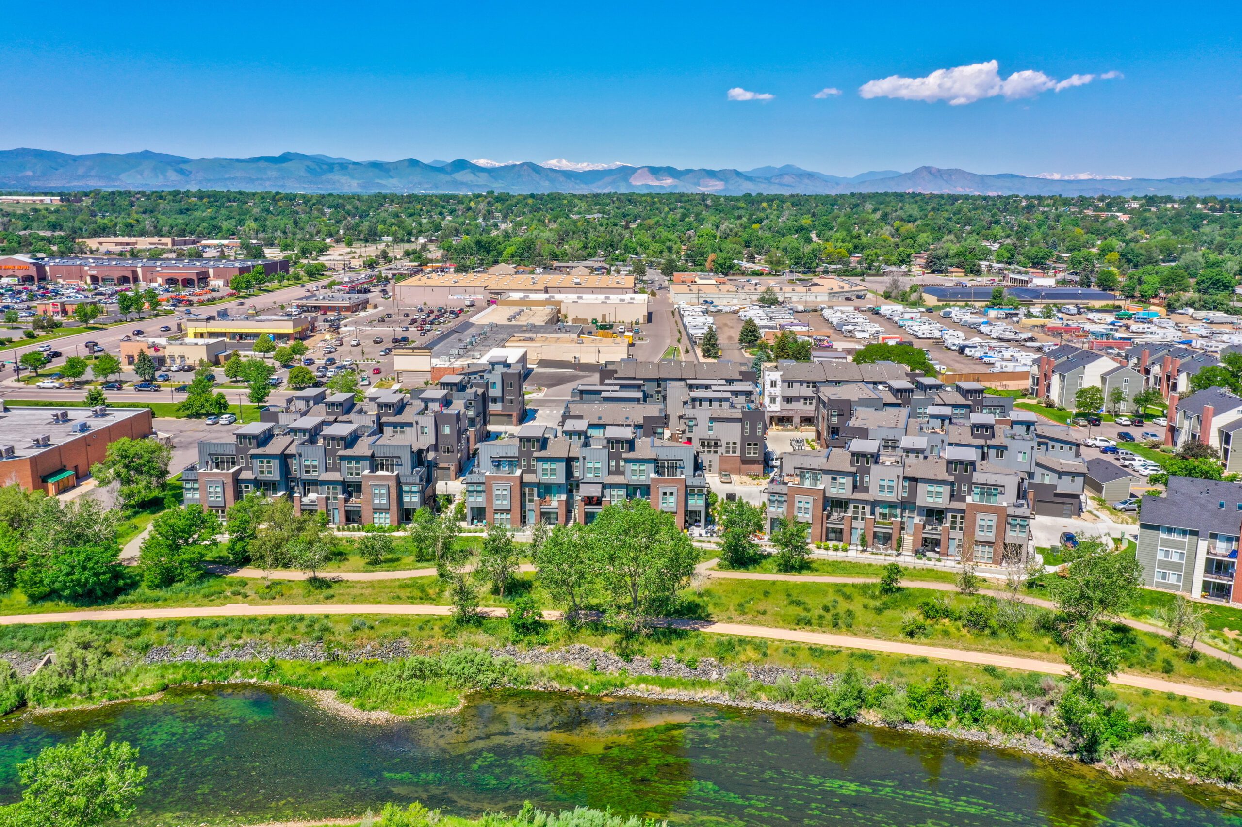 The two- and three-story townhomes are arranged to take advantage of the river setting, with many homes featuring rooftop patios that prioritize privacy and scenic views. Direct access to the Mary Carter Greenway Trail connects residents to miles of regional paths stretching from Chatfield State Park north toward Englewood and downtown Denver, offering access to recreation and the broader trail network. Thoughtful site planning integrated landscaped green edges and shared outdoor areas, delivering roughly 34 percent open space within a compact footprint.