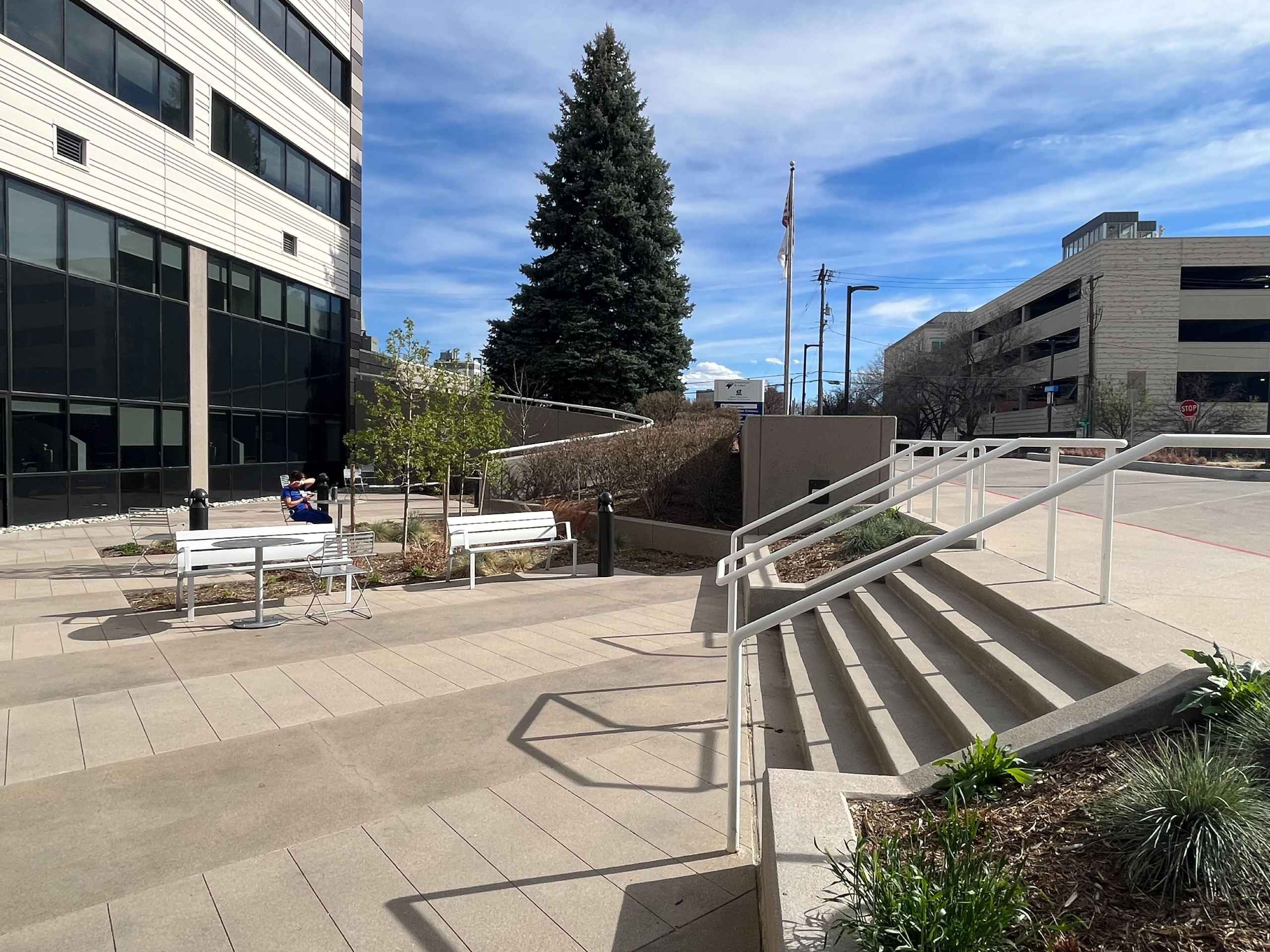 HealthOne put together a team of Perkins + Will for the architecture and Redland for the civil engineering and landscape architecture. Layton Construction Company was the contractor. Since the project was built over an existing parking garage, challenges included designing planters for landscaping over a structure and coordinating grading to work with a new snowmelt system. The entitlement included amending the Planned Building Group for the entire 24-acre campus through the City and County of Denver to include the proposed project. The adjacent existing public sidewalks were also analyzed and updated to meet the City’s ADA requirements.
