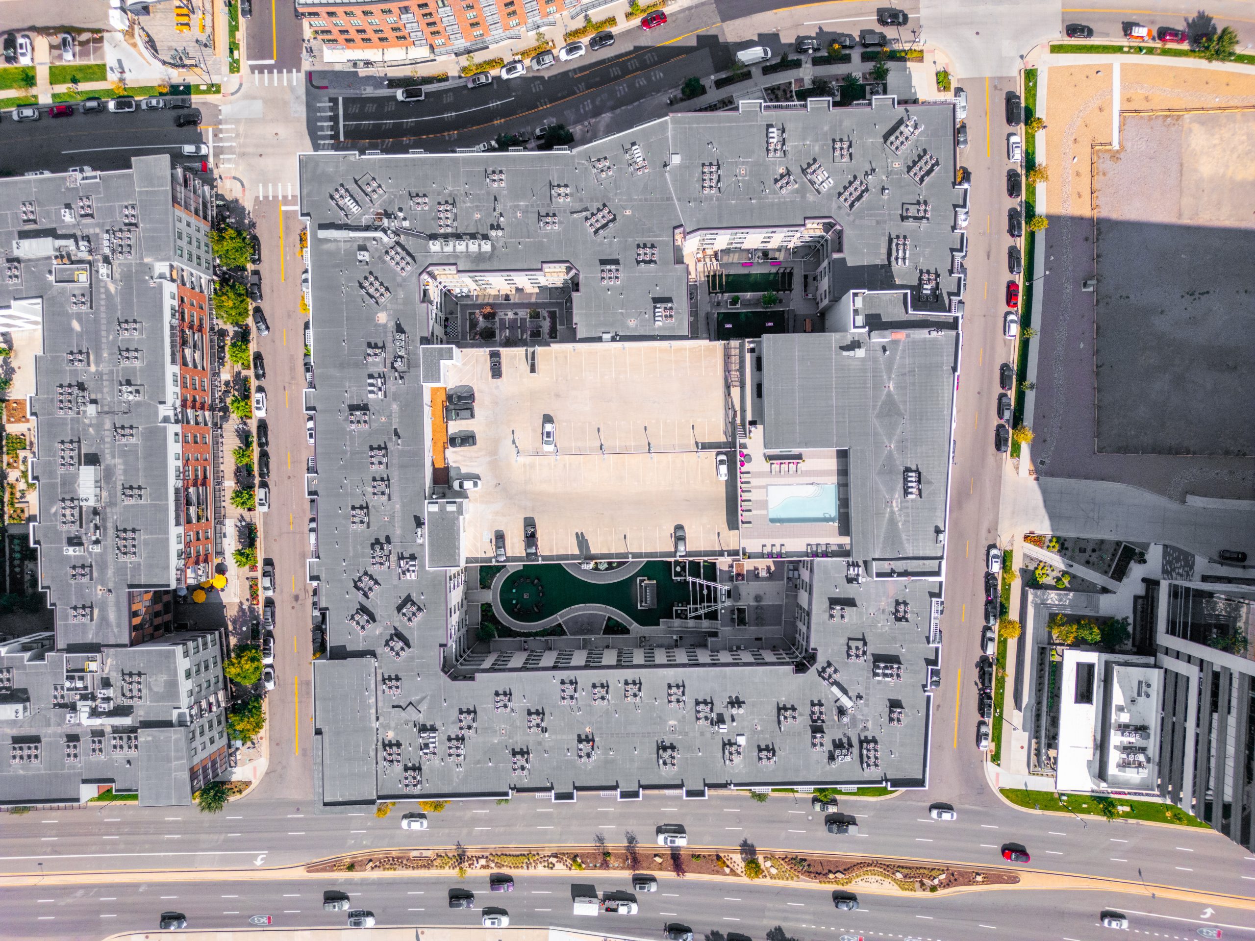 The five-story development includes 357 apartment units above neighborhood coffee shops, restaurants, and services. Residents can step outside to light rail and nearby trails or stay home and enjoy shared courtyards, outdoor gathering areas, fitness spaces, and a rooftop pool.